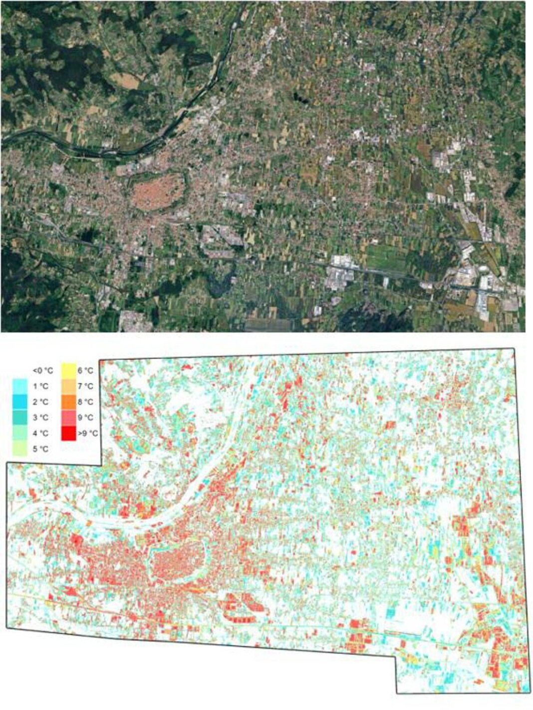 Mappa dell’intensità dell’isola di calore urbana calcolata come la differenza tra la temperatura di ogni punto e la temperatura media delle aree naturali, ricavata dall’immagine termica aerea ad alta risoluzione