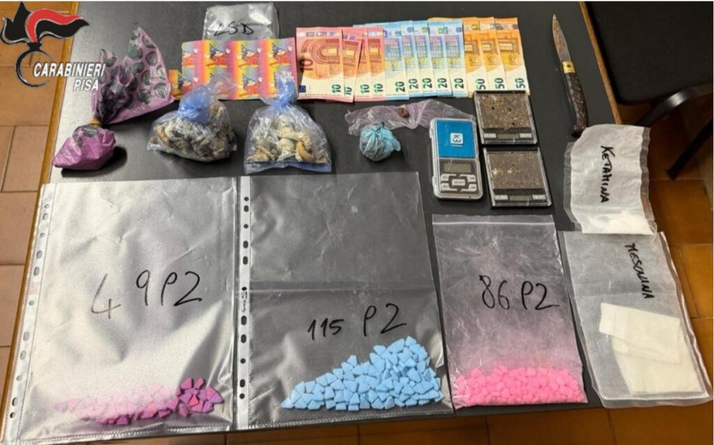 Durante la perquisizione sono stati rinvenuti e sequestrati 190 pasticche di Lsd, 150 pasticche di Ecstasy (oltre a 51 grammi in polvere), 7,7 grammi di ketamina, 4,3 grammi di mescalina, circa 39 grammi di funghi allucinogeni e una modica quantità di hashish.