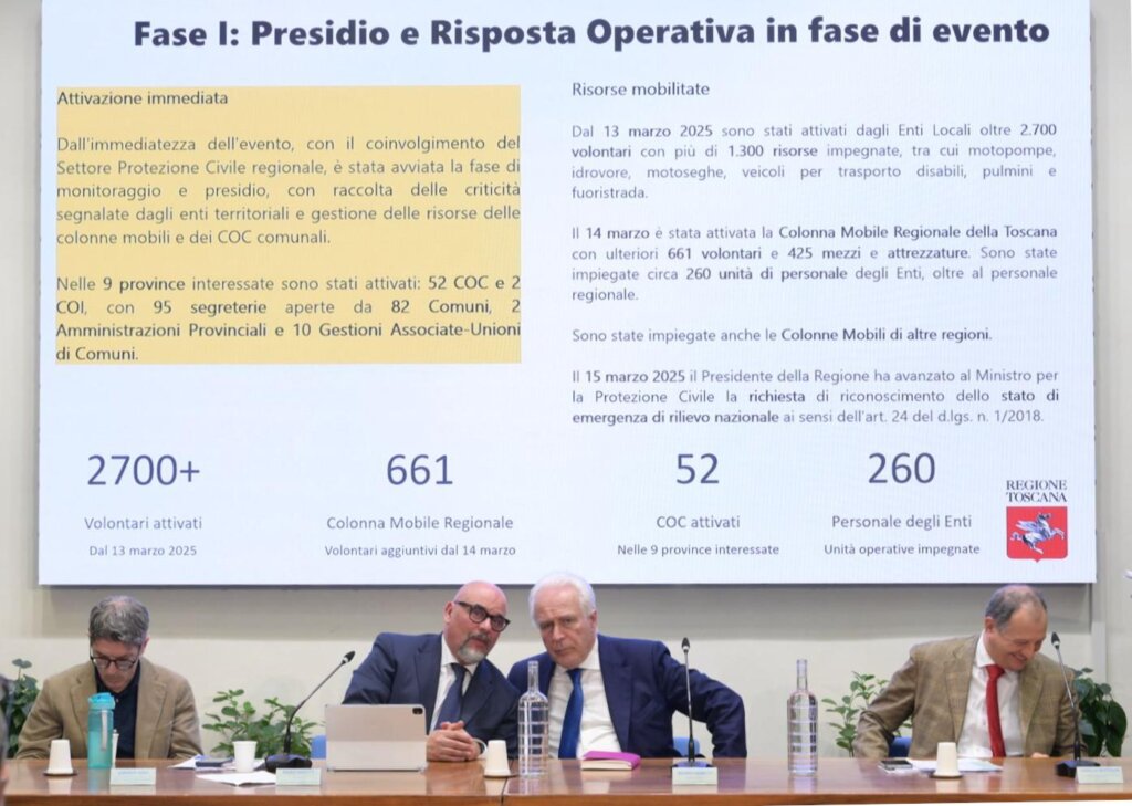 Il 14 marzo è stata attivata la Colonna Mobile regionale della Toscana con ulteriori 661 volontari 425 mezzi e attrezzature. Sono state impiegate circa 260 unità di personale degli enti oltre al personale regionale. Il 15 marzo 2025 il presidente della Regione ha avanzato al ministro per la protezione civile la richiesta di riconoscimento dello stato di emergenza di rilievo nazionale.